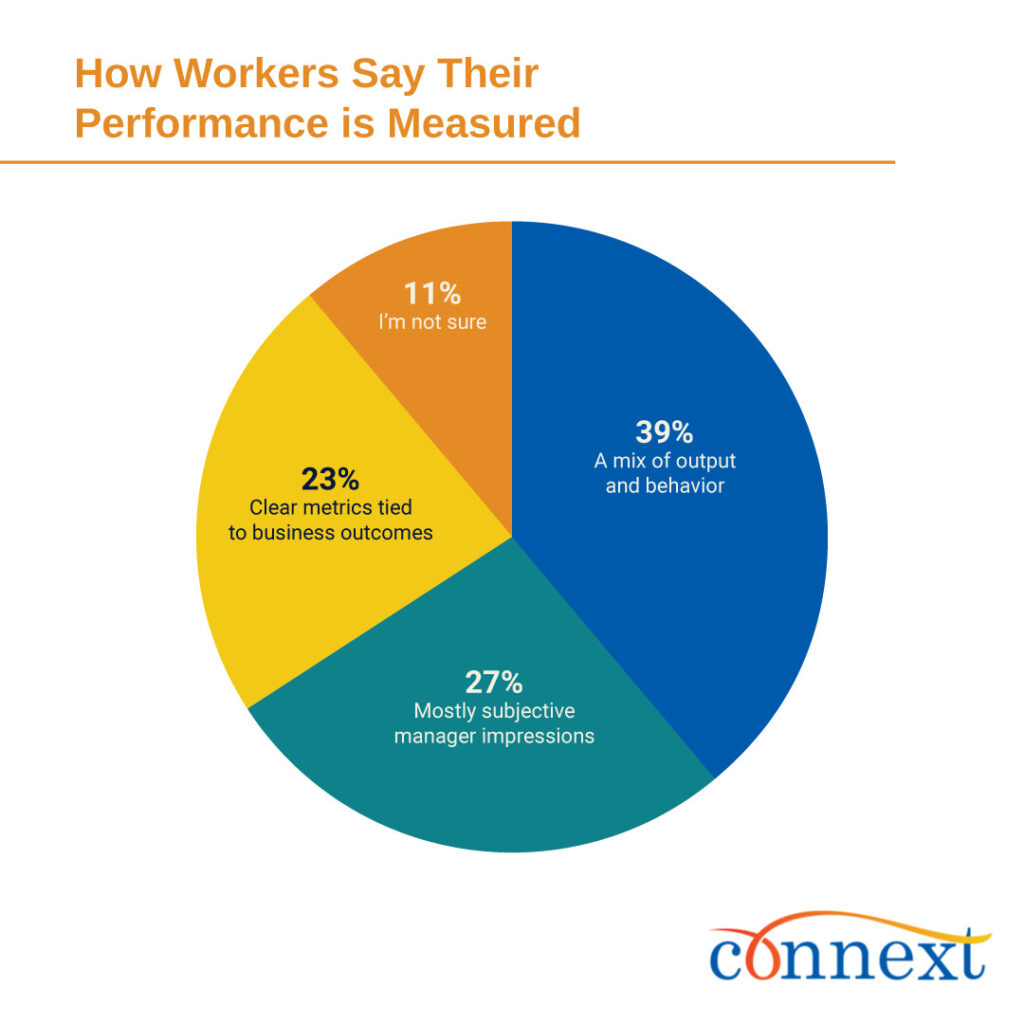 Only 23% say their performance is tied to clear, outcome-based metrics, while most report being judged on visibility, speed, and face time.