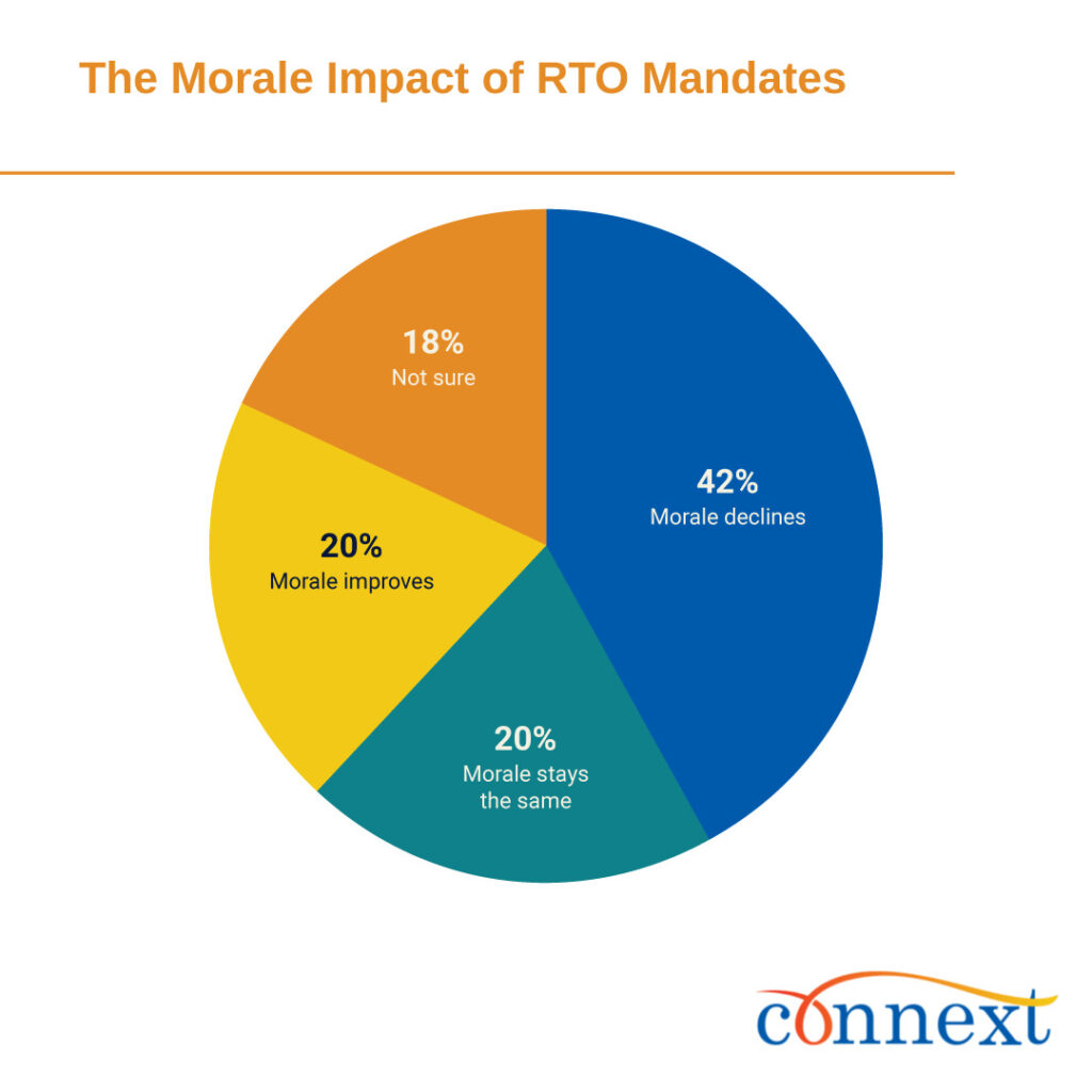 69% of workers believe RTO mandates are largely about visibility, not productivity, and morale is projected to decline by a net -22 points as a result.
