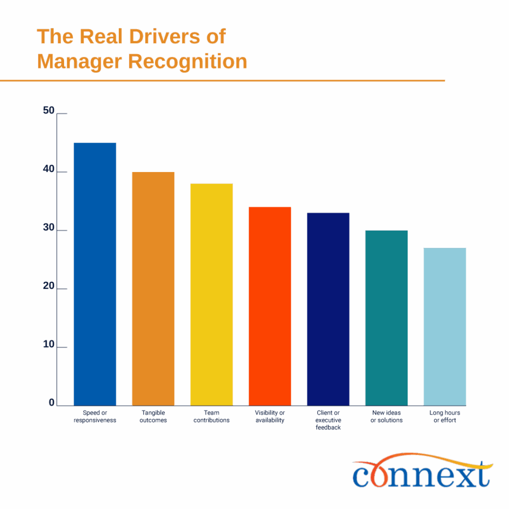 - Speed Over Quality: 45% say praise goes to speed and responsiveness, outpacing tangible outcomes (40%) and new ideas (30%).