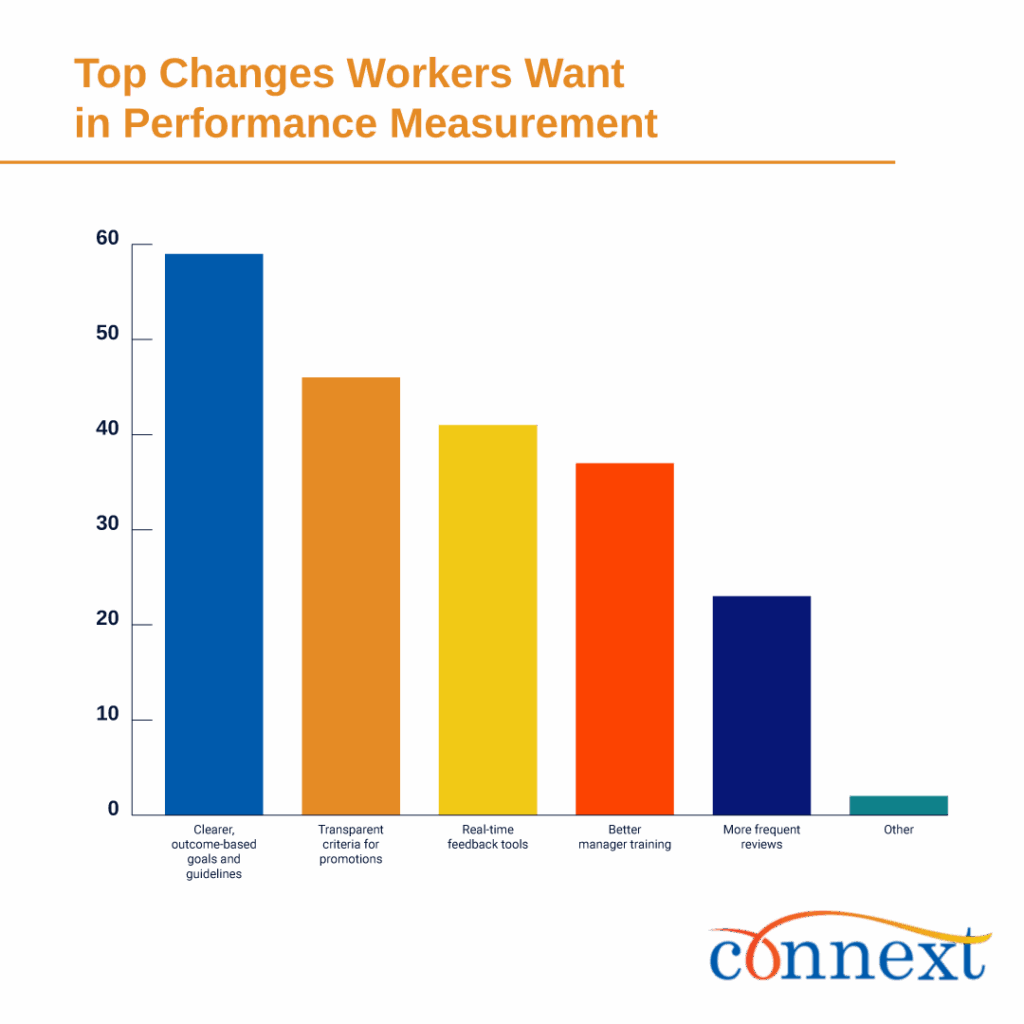The changes workers most want are straightforward: clearer outcome-based goals (59%), transparent promotion criteria (46%) and real-time feedback tools (41%). By contrast, only 23% want “more frequent reviews.” Workers don’t want additional processes, they want better processes.