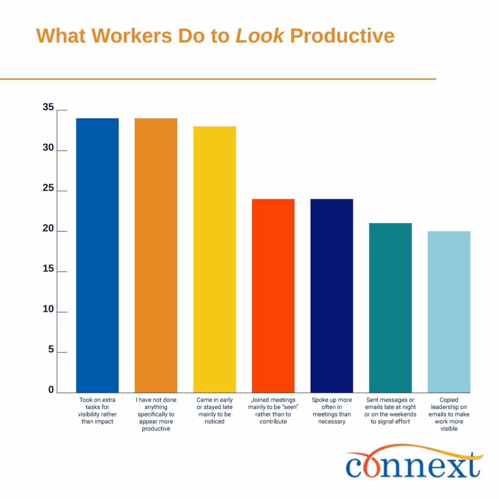 The Connext Global survey reveals a workplace stuck in misalignment. Team members are trusted to do tasks independently, but judged by practices that don’t reflect real impact. Productivity theater is the natural outcome of this system, as workers adapt to what gets rewarded rather than what drives value.