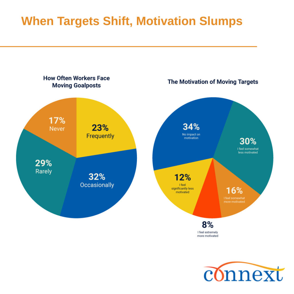 When measures shift, motivation falters. A majority (55%) say their performance goals change at least occasionally without clear follow-through and 42% say unclear or moving targets make them less motivated.