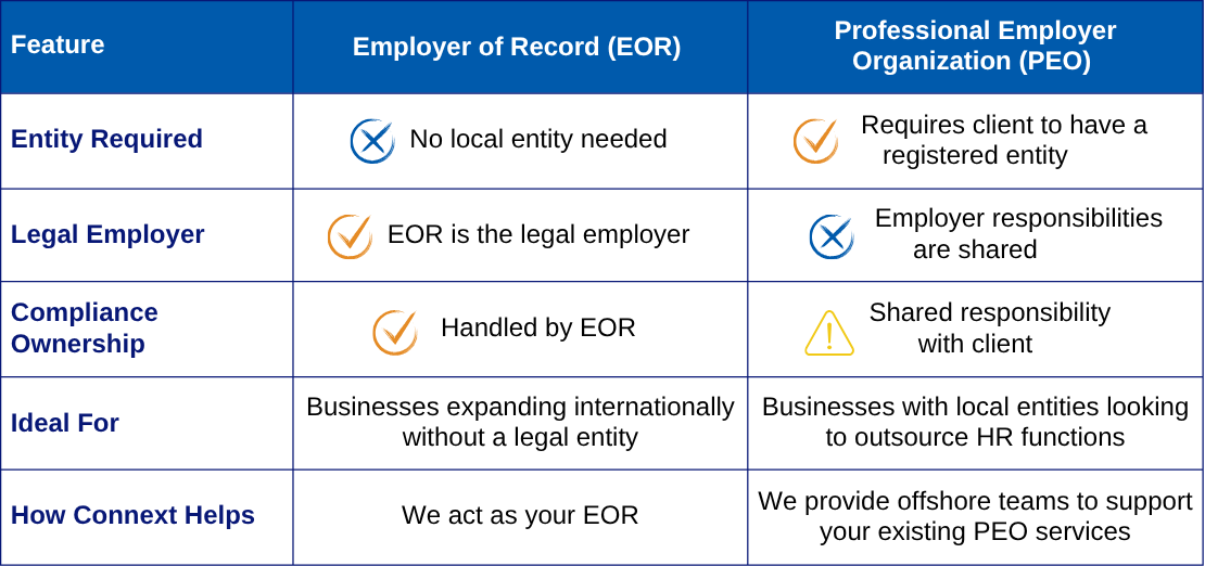 Global workforce expansion doesn’t follow a one-size-fits-all approach. That’s why Connext supports both Employer of Record (EOR) and Professional Employer Organization (PEO) models helping businesses choose the structure that best aligns with their goals, risk profile, and internal capabilities.