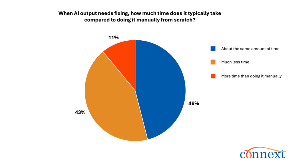- Fixing Can Erase The Time Savings: When AI output needs fixing, nearly half (46%) say it takes about the same time as doing it manually and 11% say it takes more time.
