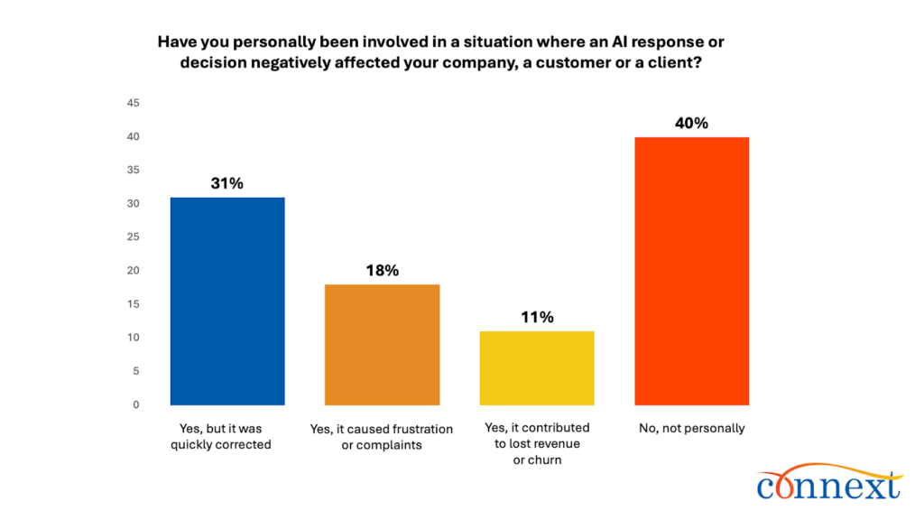 One of the clearest signals from the survey data is how often negative impact is firsthand. A majority (60%) say they have personally been involved in AI negatively affecting outcomes. That includes 18% who say it led to frustration or complaints and 11% who say it contributed to lost revenue or churn.