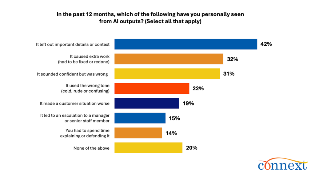 - Context Loss Leads Breakdowns: Respondents say AI left out important details or context (42%), caused extra work to fix or redo (32%) and sounded confident but was wrong (31%).
