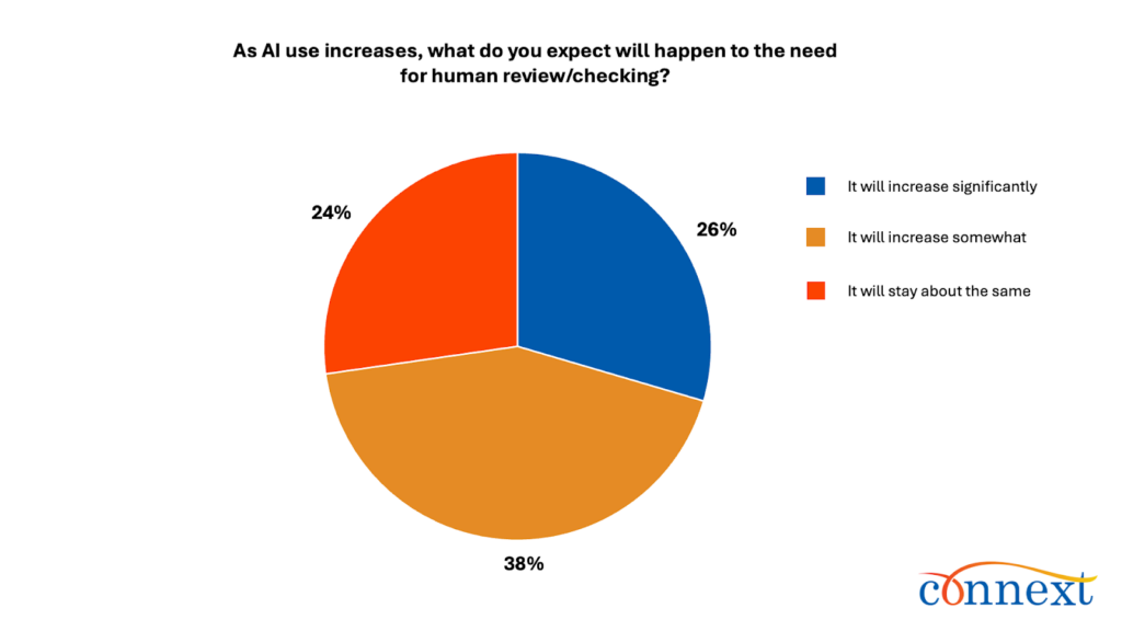 - Demand for Human Review Is Rising: Nearly two-thirds (64%) expect the need for human review or checking to increase, with 26% saying significantly and 38% saying somewhat.
