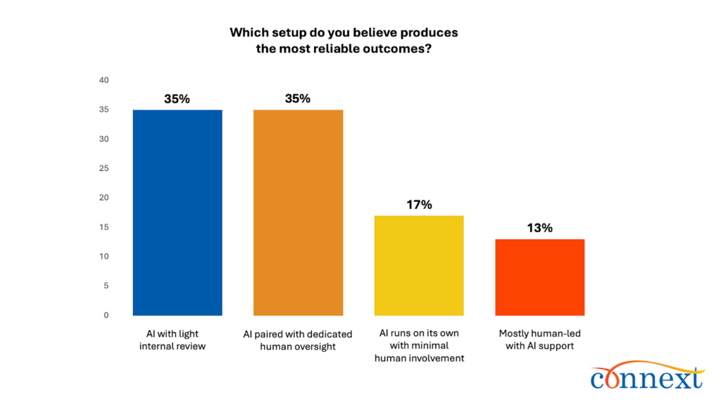 The survey draws a clear line between adoption and autonomy. When respondents describe what “reliable” AI looks like, only 17% say it can run on its own. 7 in 10 (70%) define reliability as a hybrid model – AI plus light review (35%) or AI plus dedicated oversight (35%).