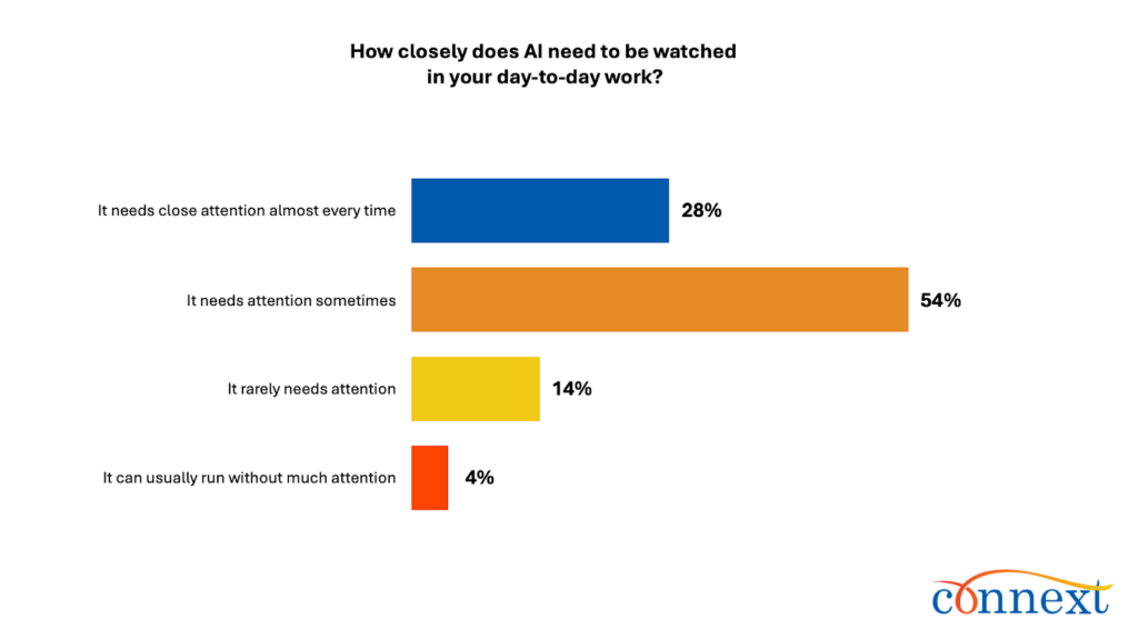 Day to day, most users say AI requires active supervision. AI needs attention almost every time (28%) or sometimes (54%). Just 4% say it can usually run without much attention.