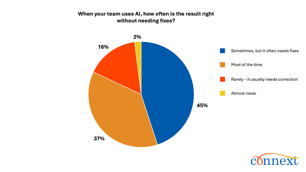 The follow-up layer exists for a reason: output is often not ready-to-use. Only 37% say AI is right without fixes most of the time. Nearly two in three (63%) say it is right only sometimes or less, including 45% sometimes, 16% rarely and 2% almost never.