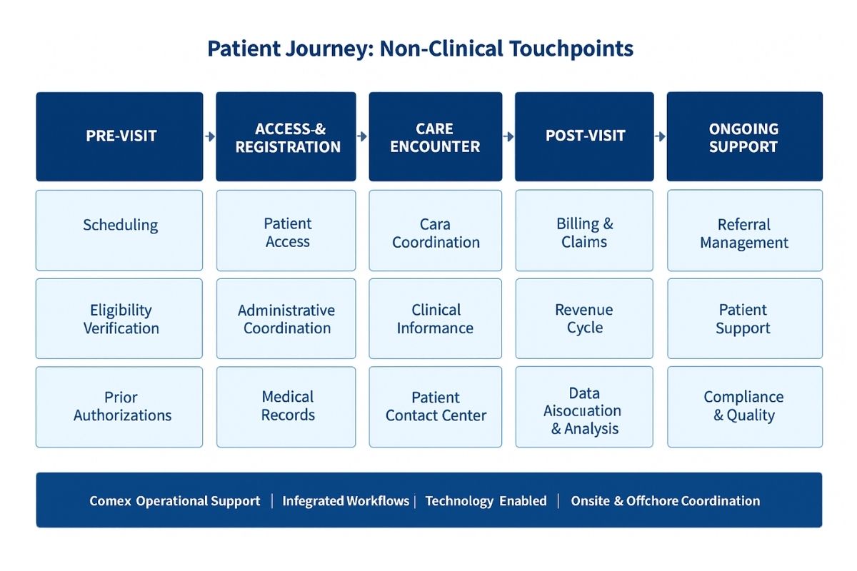 Healthcare organizations depend on non-clinical teams to function. Patient access, scheduling, revenue cycle, medical records, referrals, prior authorizations, billing, patient contact center operations, care coordination, clinical informatics, data abstraction and analysis, and administrative coordination are not background noise. They are the operational infrastructure that makes care delivery possible. When those functions are understaffed or poorly structured, the disruption does not stay in the back office. It moves upstream, and it moves fast.